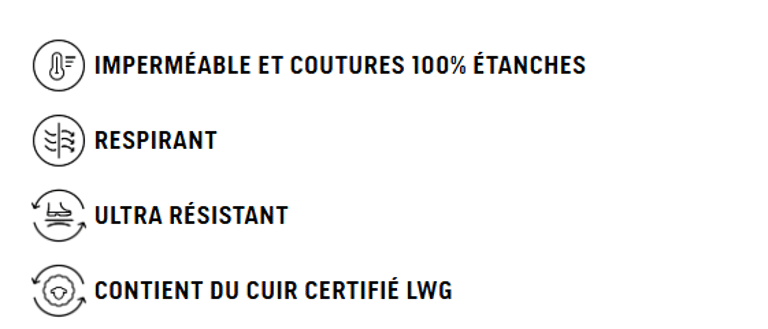 Tige : 90% cuir pleine fleur de vache et 10% polyester Membrane : 100% polyester Pare-pierres : Synthétique Semelle extérieure : Caoutchouc
